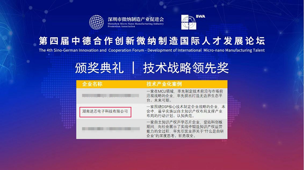 1月6日,由深圳市微納制造產(chǎn)業(yè)促進(jìn)會、德國聯(lián)邦經(jīng)濟(jì)發(fā)展和對外貿(mào)易聯(lián)合總會(BWA)聯(lián)合主辦,西麗湖人才服務(wù)中心承辦的“第四屆中德合作創(chuàng)新微納制造國際人才發(fā)展論壇”于深圳順利舉行,論壇圍繞微納制造技術(shù)產(chǎn)業(yè)化、國際合作、科創(chuàng)人才發(fā)展等話題進(jìn)行了演講和探討。在“微納制造技術(shù)產(chǎn)業(yè)化優(yōu)秀案例評選”中,進(jìn)芯電子榮獲“技術(shù)戰(zhàn)略領(lǐng)先獎”。