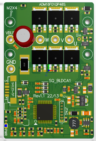 進(jìn)芯電子電動(dòng)工具電機(jī)控制方案是基于16位定點(diǎn)DSP芯片ADM16F03A開(kāi)發(fā)設(shè)計(jì)的,芯片主頻為100MHz,搭載延時(shí)濾波和運(yùn)算加速單元,內(nèi)置4K x 16 位 SARAM、(256+256+32)x16位DARAM、32Kx16位Flash,支持8路PWM輸出,SCI等豐富外設(shè)接口,內(nèi)部集成了6 NMOS Pre-Driver、運(yùn)算放大器、PGA、比較器、高速ADC等模塊,具有高整合度、高抗干擾、高可靠性的特點(diǎn),非常適用于BLDC/PMSM電機(jī)方波、FOC 驅(qū)動(dòng)控制。