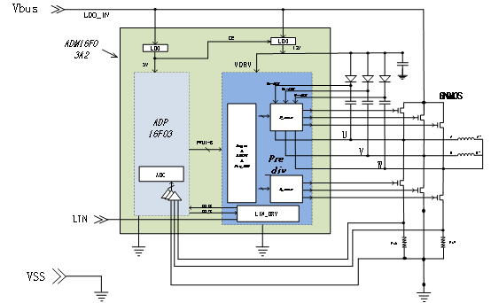 如以下框圖所示,集成的5V LDO和12V LDO可以將母線直接接入LDO_IN引腳,無需其他降壓、分壓器件;同時內(nèi)置的6NMOS預(yù)驅(qū)動器只需要在外圍簡單配置boost器件即可使用;集成的LIN驅(qū)動器在需要與其他LIN主(從)機進行通信時,也可方便快捷的應(yīng)用。結(jié)合我司自研的三半橋驅(qū)動兩相四線步進電機的軟硬件資源,可以實現(xiàn)用更少的芯片資源占用、更低成本的硬件來實現(xiàn)同樣優(yōu)秀的步進電機控制。