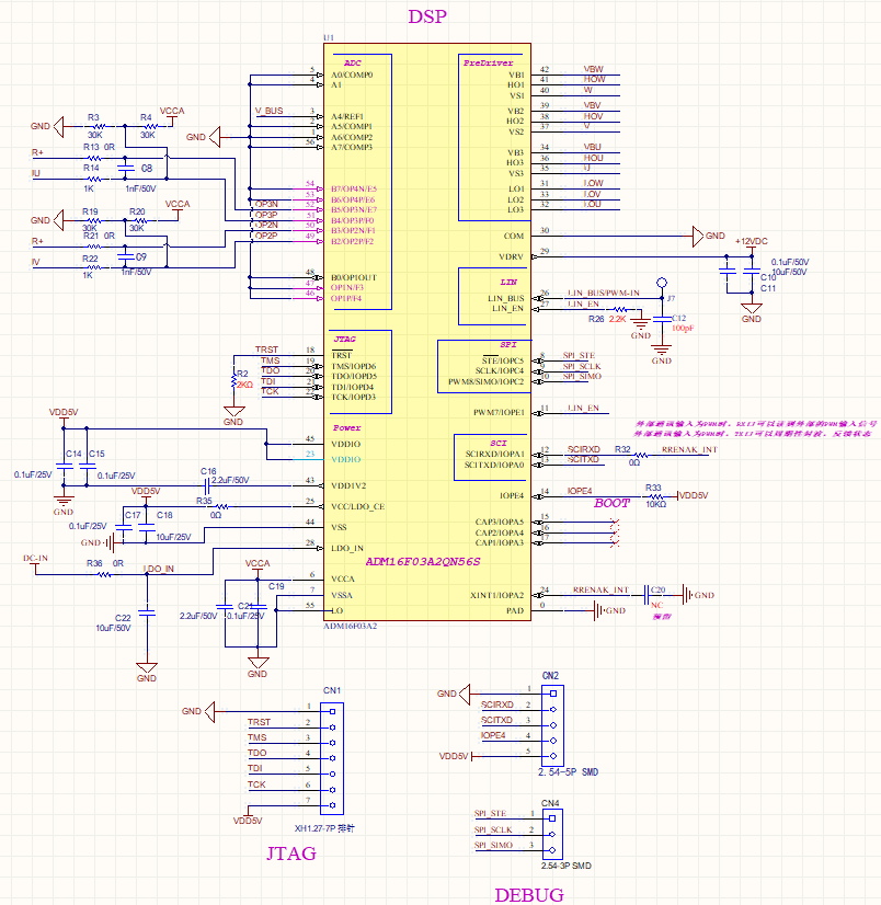 ADM16F03A2最小系統(tǒng)如下圖所示,包含JTAG接口、SPI通信接口、串口、PWM模塊、ADC模塊等。系統(tǒng)自帶的運放PGA可以通過外圍電阻配置為差分模式用于相線電流采樣。當(dāng)需要用到SPI調(diào)試時,可以通過SPI接口,借助進芯SPI通訊調(diào)試工具進行SPI通信調(diào)試;當(dāng)需要離線燒錄程序時,通過3V3、TX、RX、GND信號測試焊盤,借助進芯的離線燒錄工具可實現(xiàn)快速的脫機燒錄。