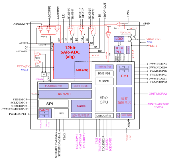 • 主頻 100MHz高性能16位CPU,采用哈佛總線架構(gòu),集成算力加速單元;