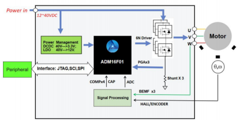 ADM16x是一款高度集成的高性能BLDC/PMSM控制器,內(nèi)部集成了6路 NMOSPre-Driver,運(yùn)算放大器,PGA,比較器,高速 ADC,SCI,SPI 等模塊。同時(shí),它采用高性能16位CPU,內(nèi)嵌 32Kx16 位 Flash, 512x16位ROM,最高工作頻率為40MHZ,可滿足高性能無刷電機(jī)控制的應(yīng)用要求,并簡化系統(tǒng)成本。